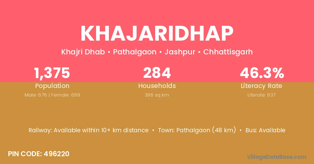 Pathalgaon (48 km) is the nearest town to Khajaridhap village for major economic activities and is located approximately 48 km away.