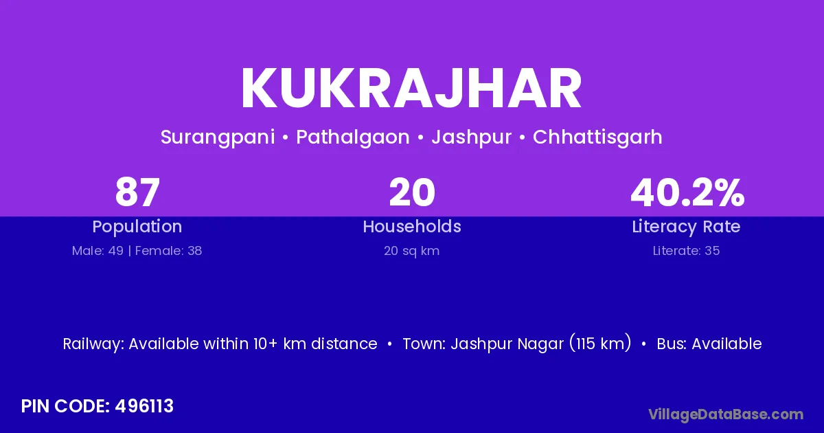 Jashpur Nagar (115 km) is the nearest town to Kukrajhar village for major economic activities and is located approximately 115 km away.
