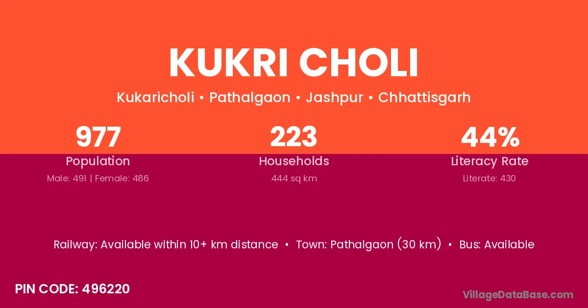 Pathalgaon (30 km) is the nearest town to Kukri Choli village for major economic activities and is located approximately 30 km away.