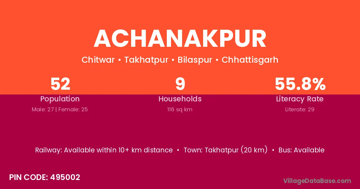 Achanakpur village has a total population of 631 people, of which 316 are males and 315 are females.