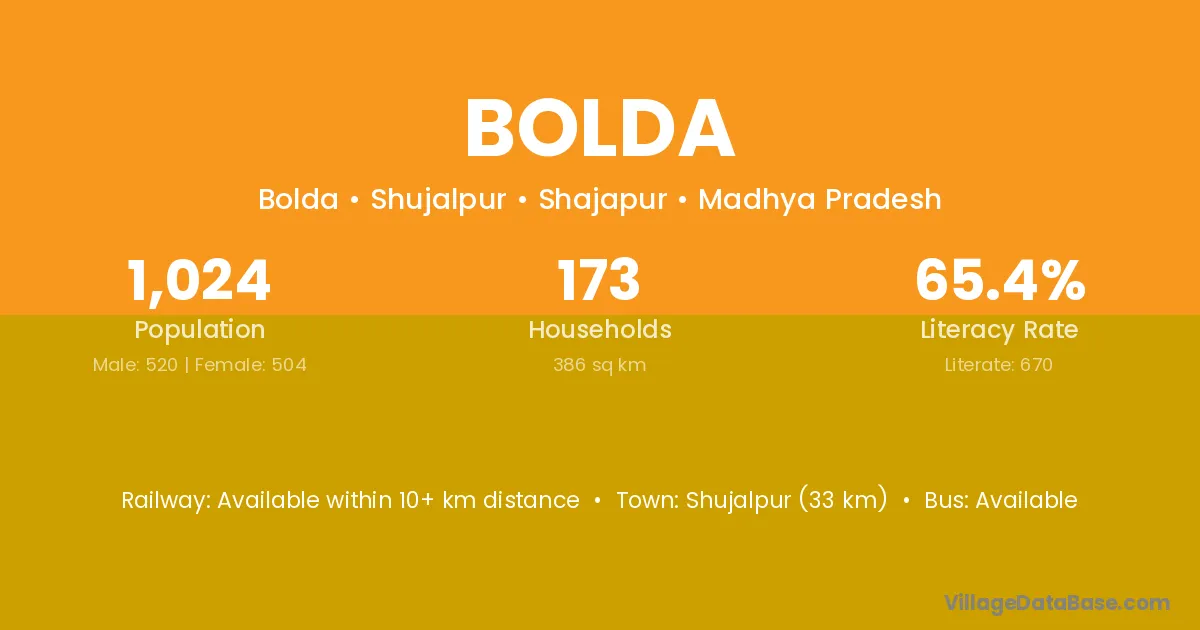 The literacy rate of Bolda village is 38.92%. Male literacy stands at 38.82% and female literacy at 39.02%.