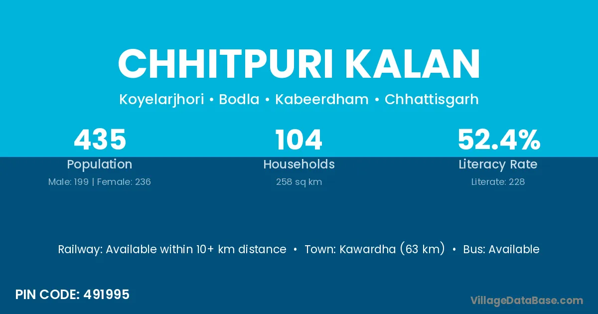 Kawardha (63 km) is the nearest town to Chhitpuri Kalan village for major economic activities and is located approximately 63 km away.