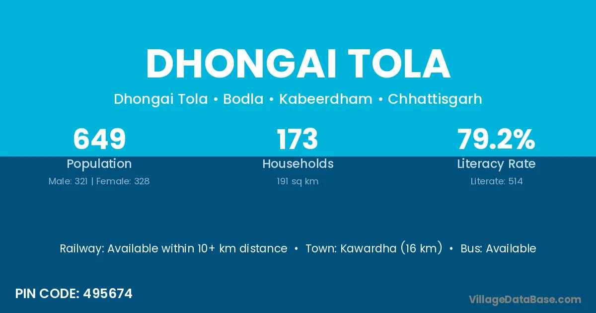 Kawardha (16 km) is the nearest town to Dhongai Tola village for major economic activities and is located approximately 16 km away.