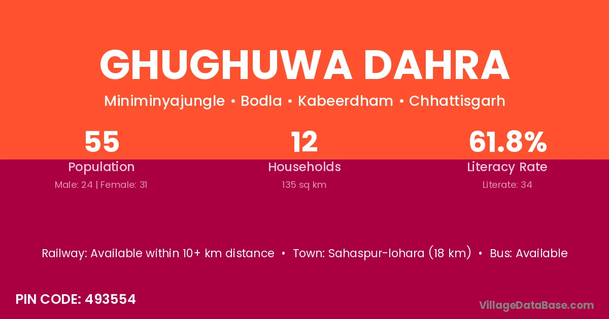 Ghughuwa Dahra village has a total population of 55 people, of which 24 are males and 31 are females.