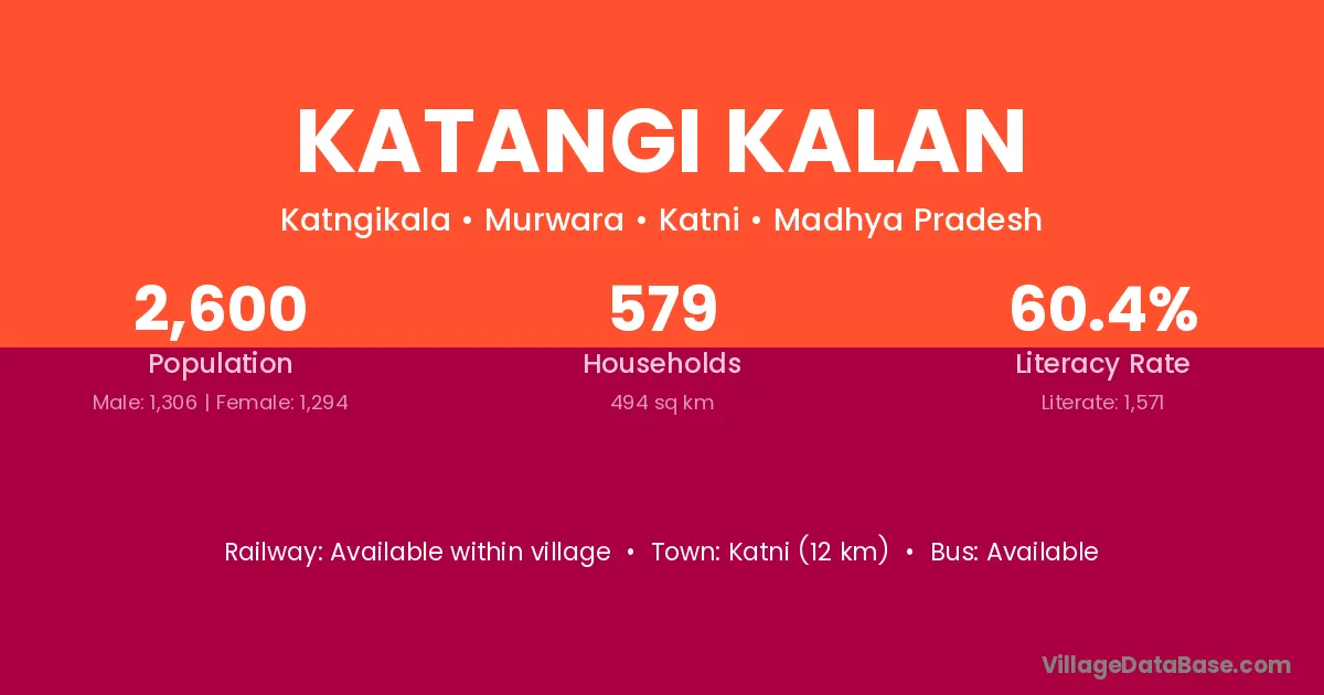 The literacy rate of Katangi Kalan village is 50.00%. Male literacy stands at 59.31% and female literacy at 41.06%.