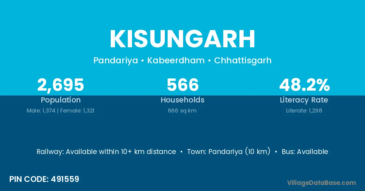 Kawardha (20 km) is the nearest town to Kisungarh village for major economic activities and is located approximately 20 km away.