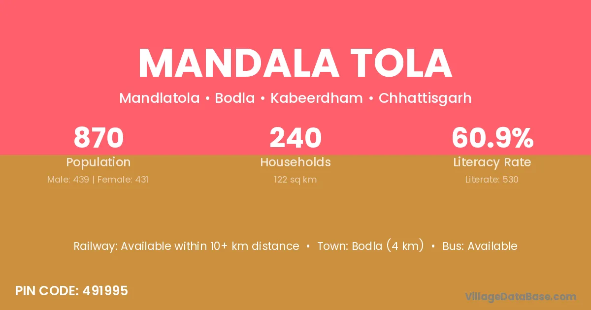 Mandala Tola village has a total population of 870 people, of which 439 are males and 431 are females.
