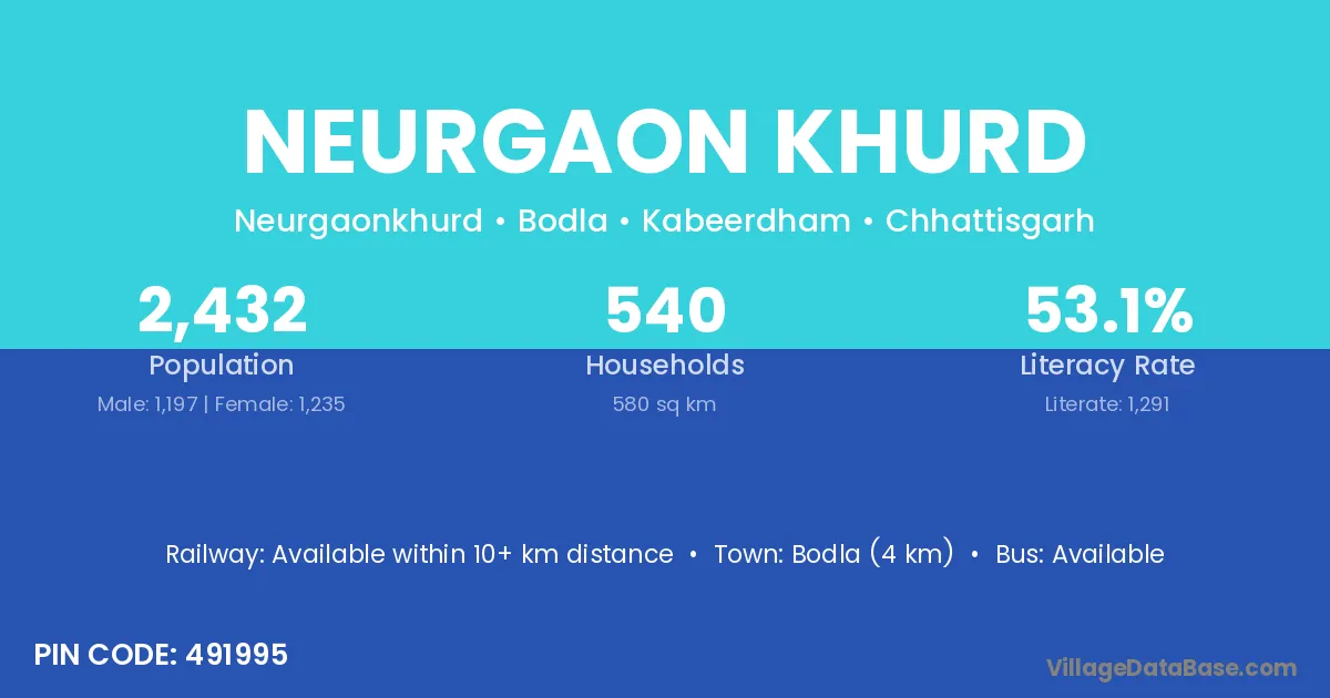 Bodla (4 km) is the nearest town to Neurgaon Khurd village for major economic activities and is located approximately 4 km away.