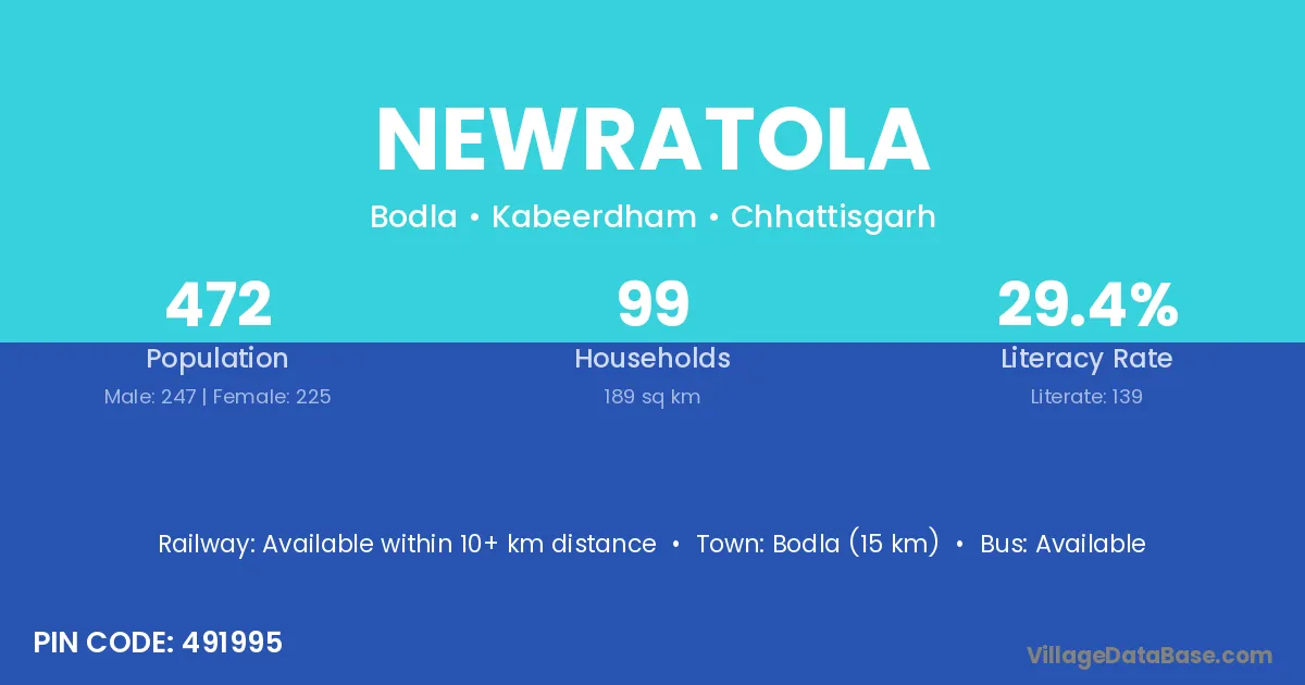 Bodla (15 km) is the nearest town to Newratola village for major economic activities and is located approximately 15 km away.