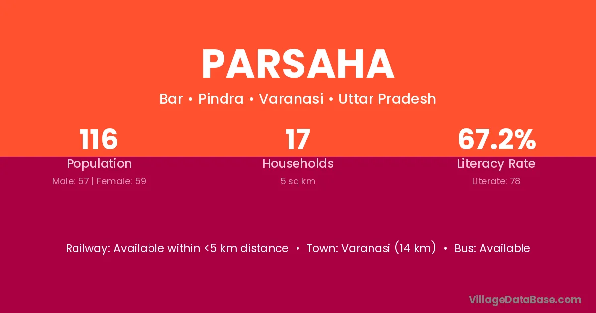 The literacy rate of Parsaha village is 41.67%. Male literacy stands at 51.81% and female literacy at 31.01%.