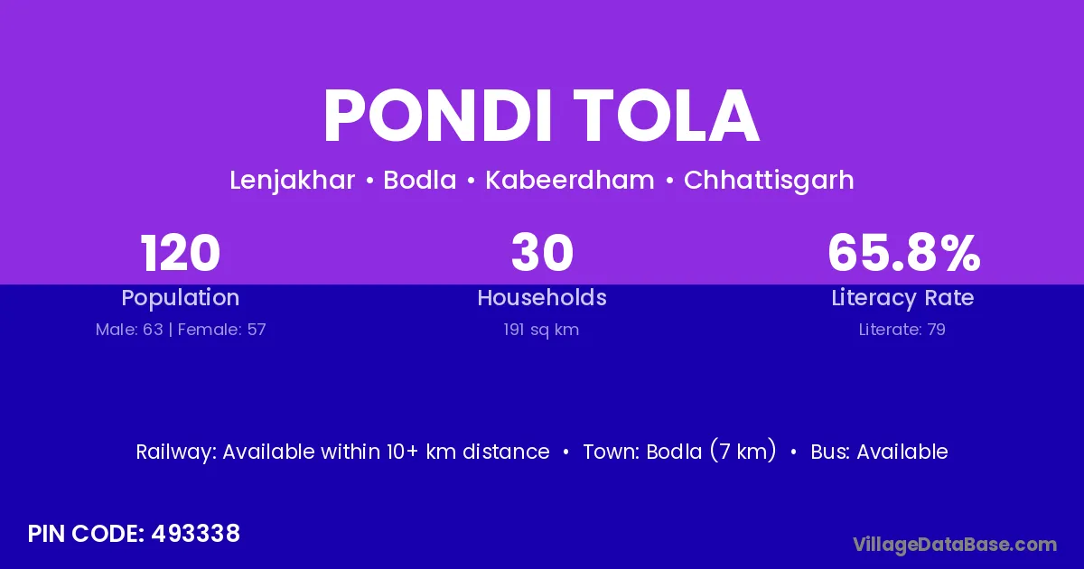 Pondi Tola village has a total population of 120 people, of which 63 are males and 57 are females.