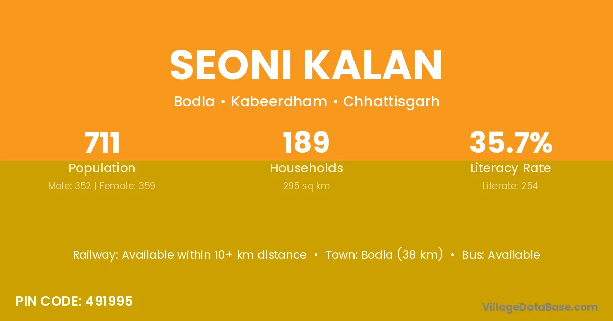 Seoni Kalan village has a total population of 711 people, of which 352 are males and 359 are females.