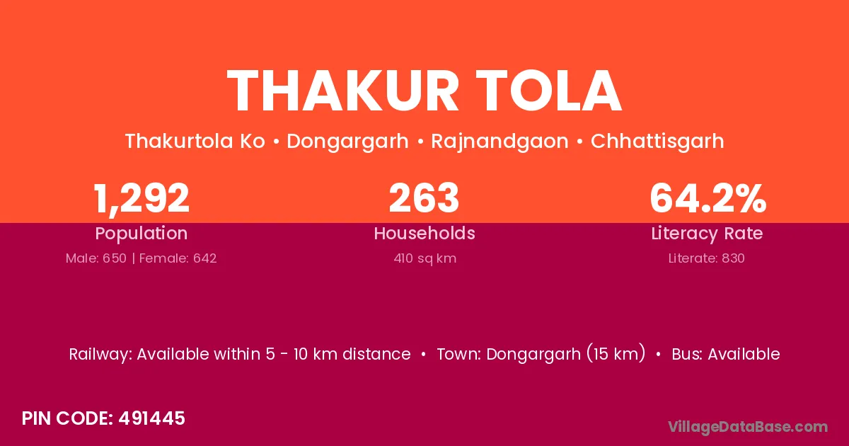 Bodla (25 km) is the nearest town to Thakur Tola village for major economic activities and is located approximately 25 km away.