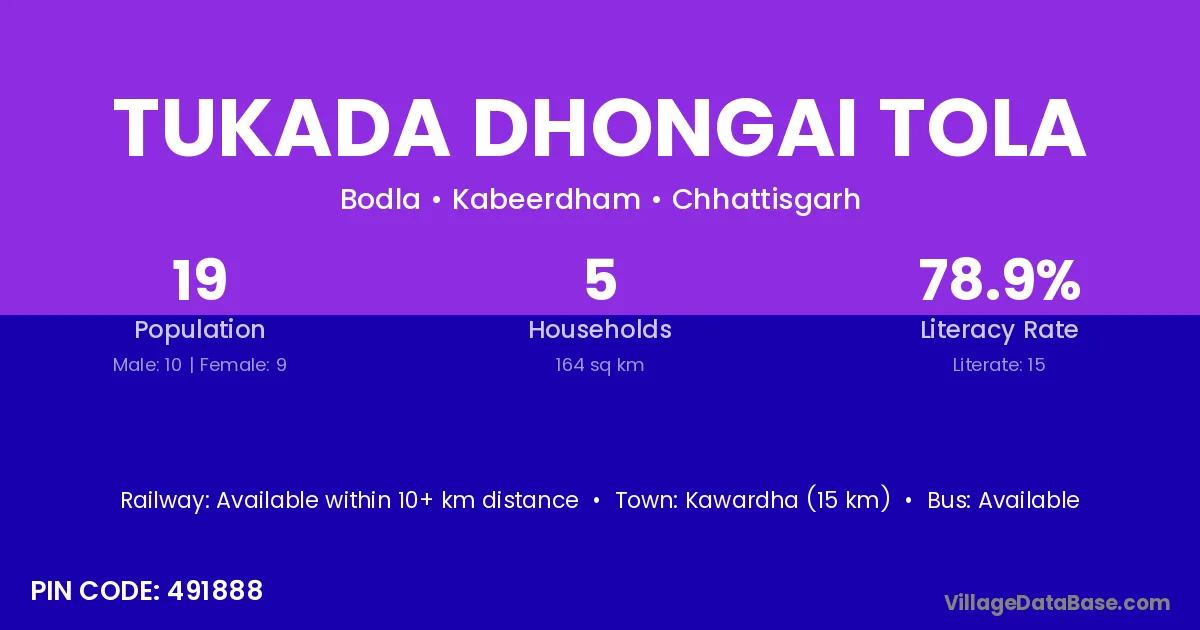 Kawardha (15 km) is the nearest town to Tukada Dhongai Tola village for major economic activities and is located approximately 15 km away.