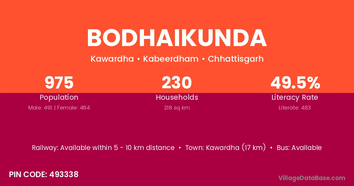 Kawardha (17 km) is the nearest town to Bodhaikunda village for major economic activities and is located approximately 17 km away.