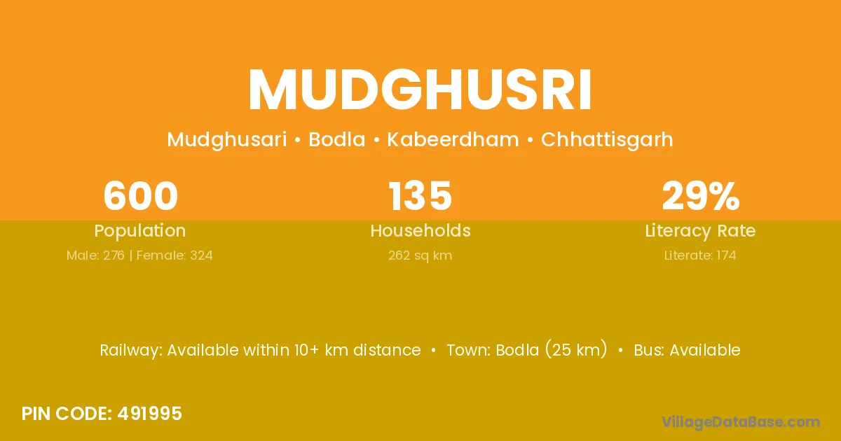 Kawardha (9 km) is the nearest town to Mudghusri village for major economic activities and is located approximately 9 km away.