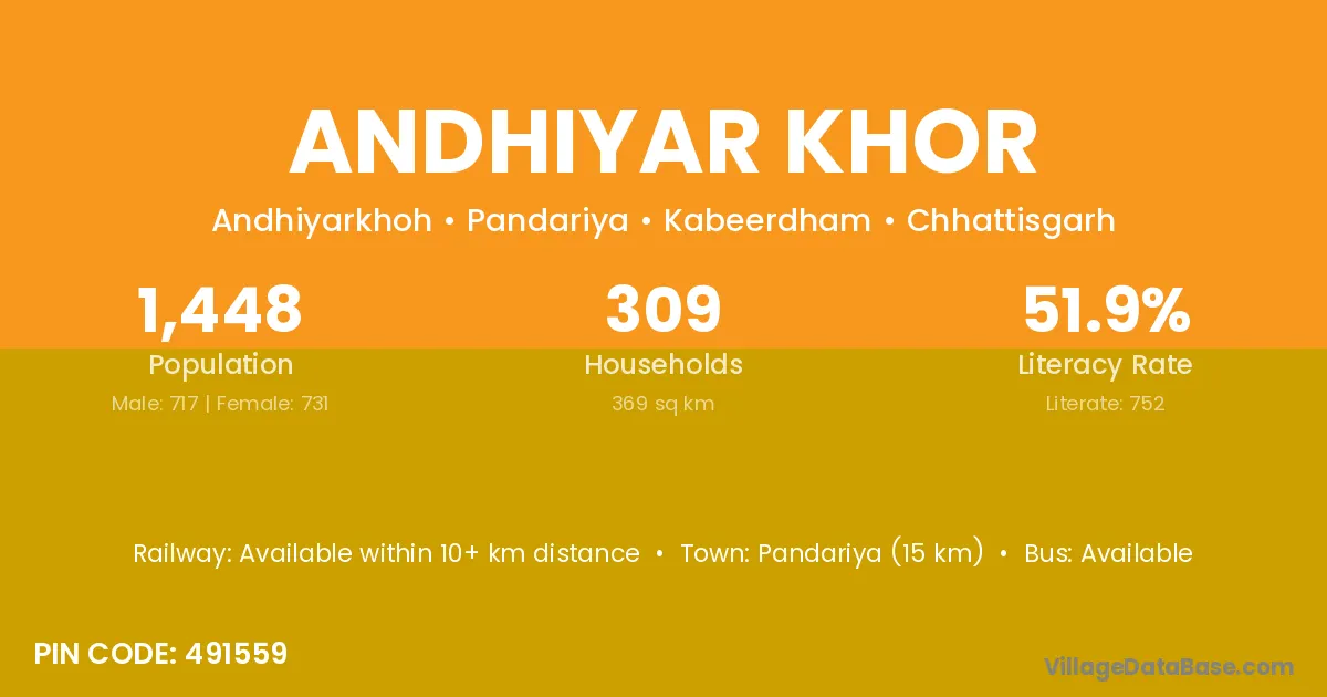 Pandariya (15 km) is the nearest town to Andhiyar Khor village for major economic activities and is located approximately 15 km away.