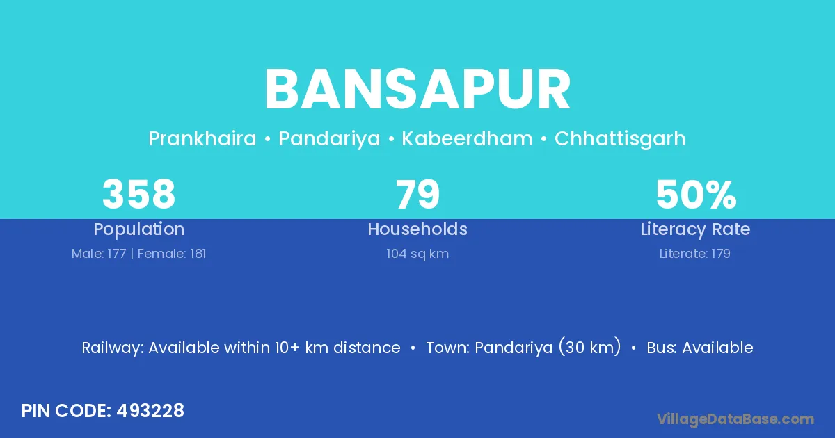 Pandariya (30 km) is the nearest town to Bansapur village for major economic activities and is located approximately 30 km away.