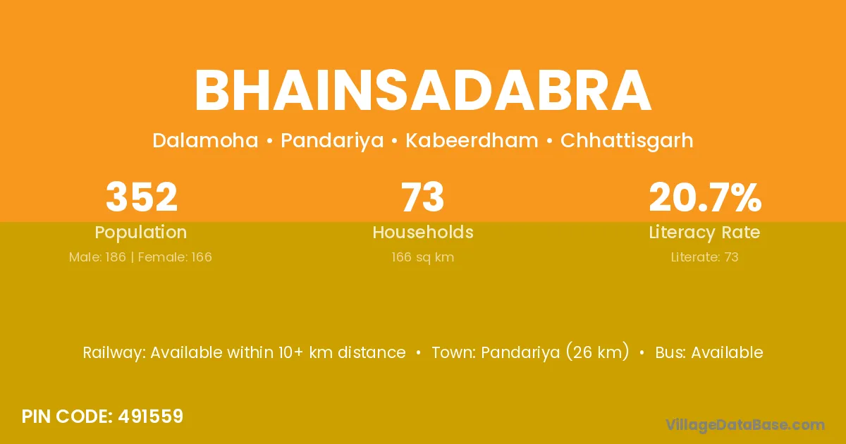 Pandariya (26 km) is the nearest town to Bhainsadabra village for major economic activities and is located approximately 26 km away.