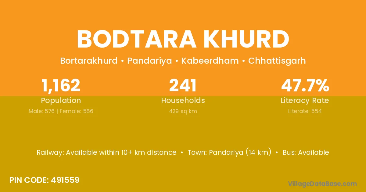Pandariya (14 km) is the nearest town to Bodtara Khurd village for major economic activities and is located approximately 14 km away.
