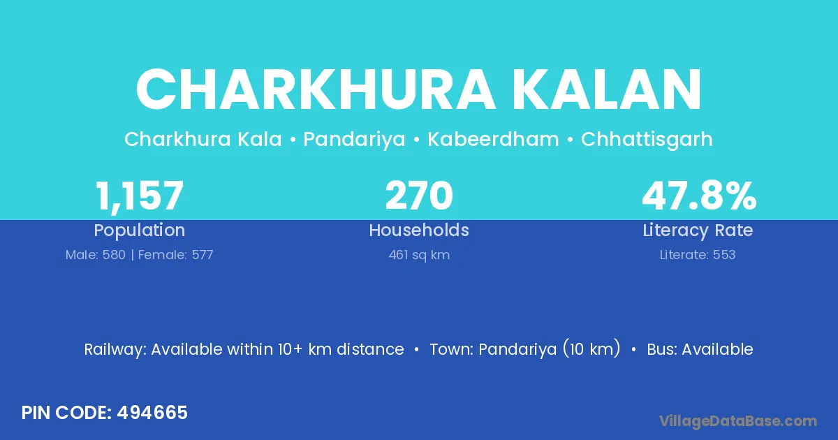 Pandariya (10 km) is the nearest town to Charkhura Kalan village for major economic activities and is located approximately 10 km away.