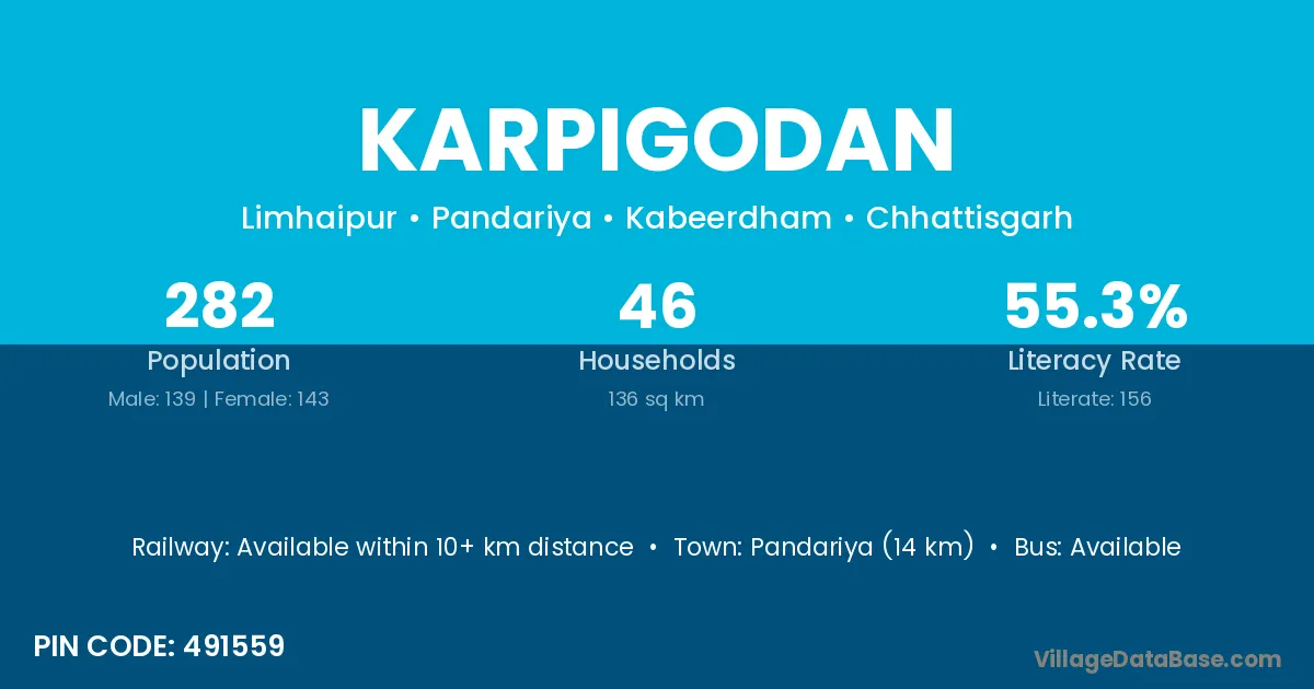 Pandariya (14 km) is the nearest town to Karpigodan village for major economic activities and is located approximately 14 km away.