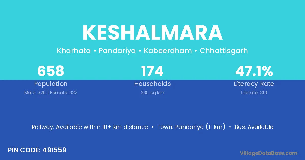 Keshalmara village has a total population of 658 people, of which 326 are males and 332 are females.