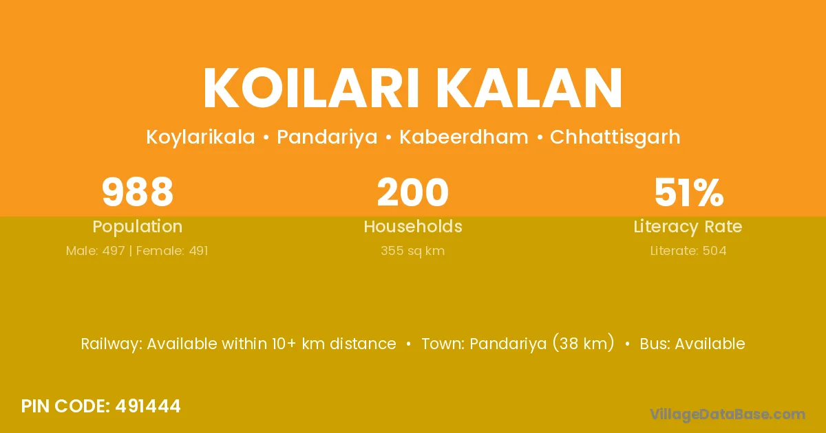 Pandariya (38 km) is the nearest town to Koilari Kalan village for major economic activities and is located approximately 38 km away.