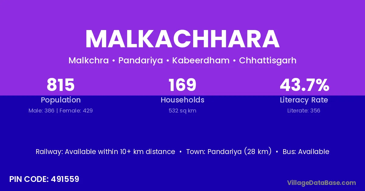 According to Census 2011 information, the village code of Malkachhara village is 491559.