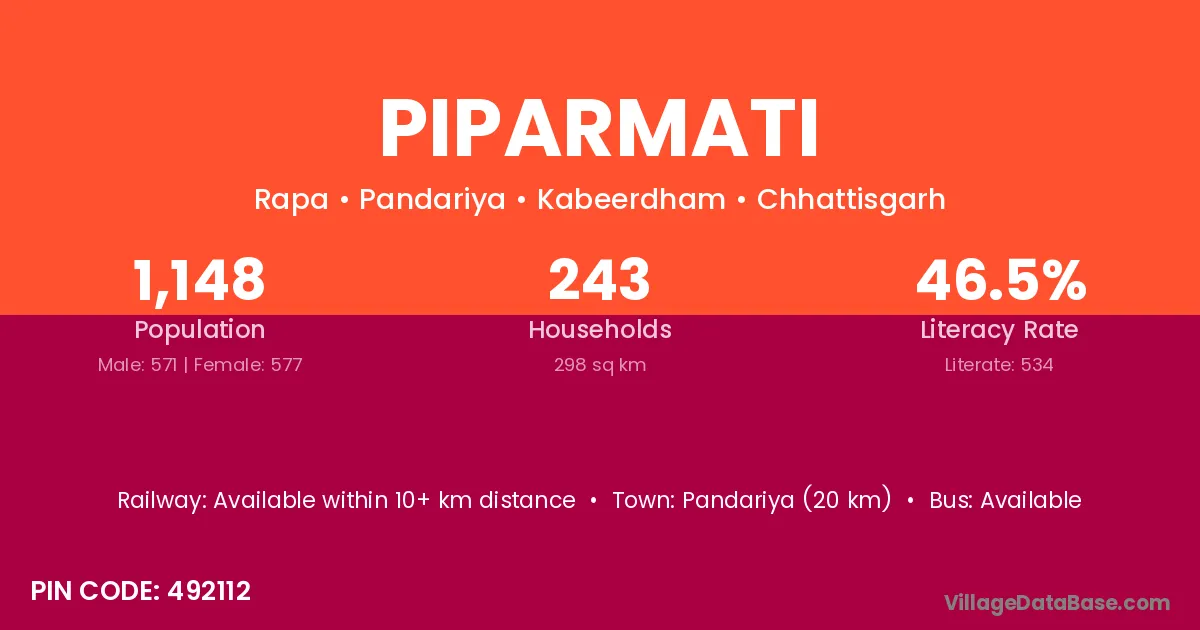 Pandariya (20 km) is the nearest town to Piparmati village for major economic activities and is located approximately 20 km away.