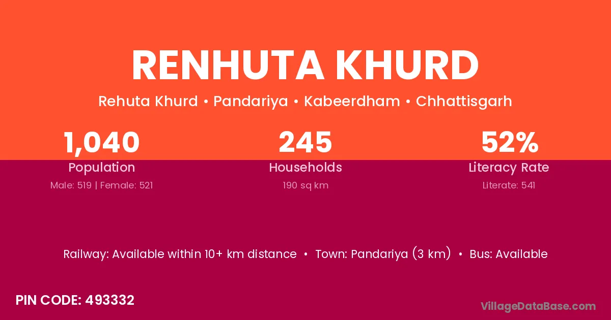 Renhuta Khurd village has a total population of 1,040 people, of which 519 are males and 521 are females.