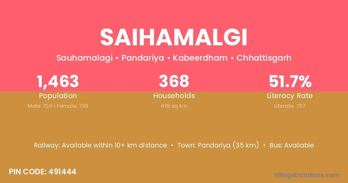 Pandariya (35 km) is the nearest town to Saihamalgi village for major economic activities and is located approximately 35 km away.