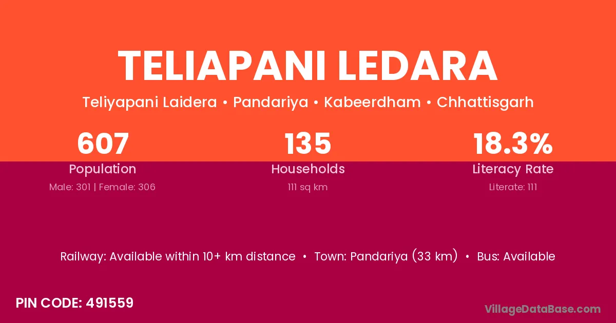 Pandariya (33 km) is the nearest town to Teliapani Ledara village for major economic activities and is located approximately 33 km away.