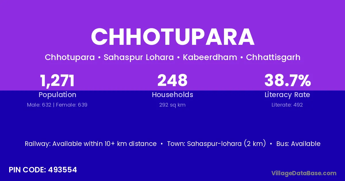 Chhotupara village has a total population of 1,271 people, of which 632 are males and 639 are females.