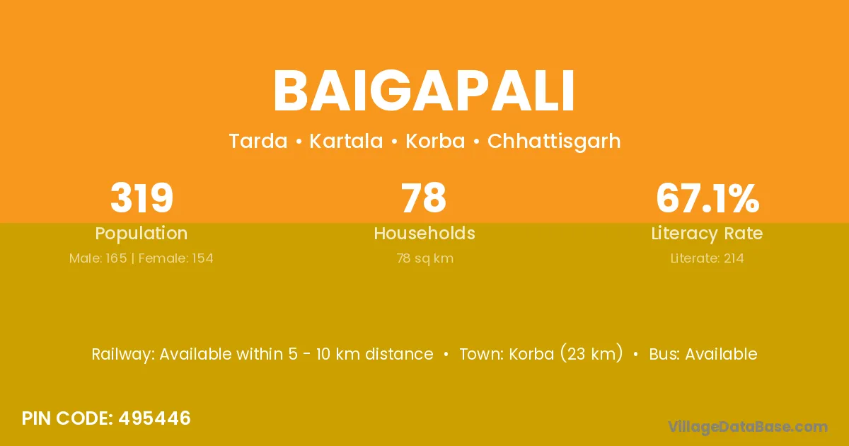 Baigapali village has a total population of 319 people, of which 165 are males and 154 are females.