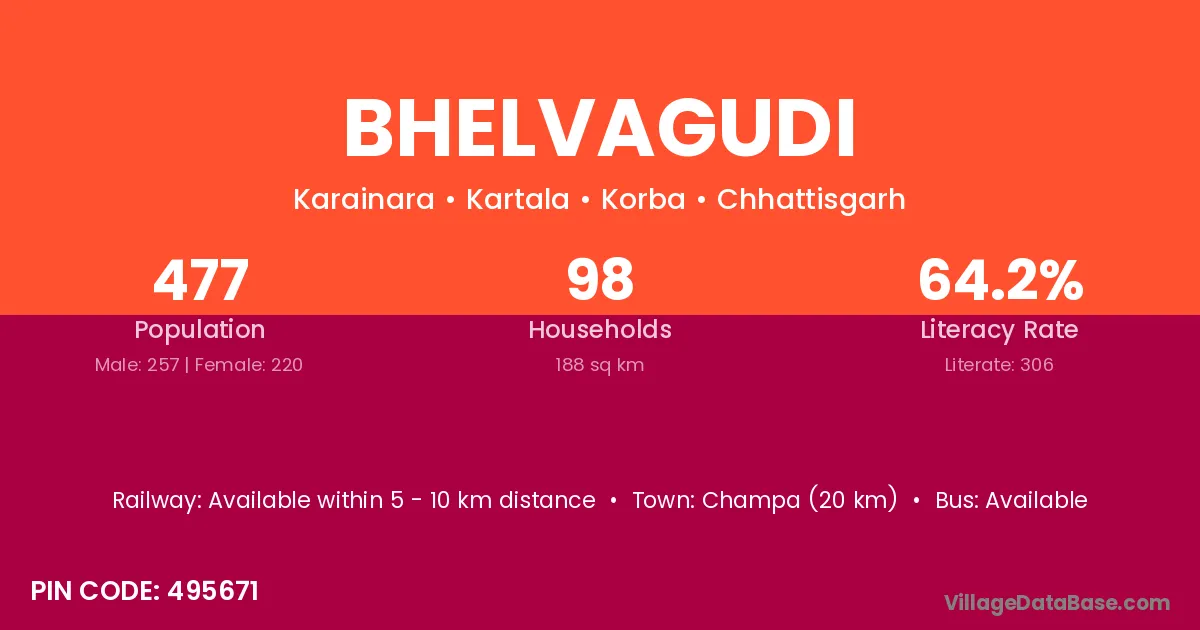 Bhelvagudi village has a total population of 477 people, of which 257 are males and 220 are females.