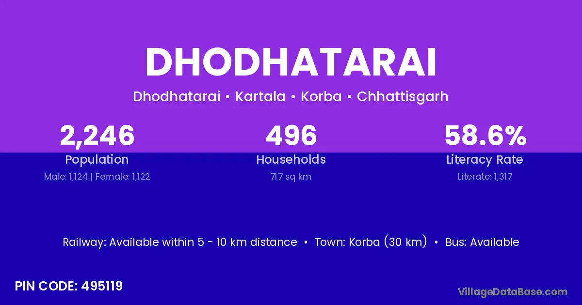 Korba (30 km) is the nearest town to Dhodhatarai village for major economic activities and is located approximately 30 km away.