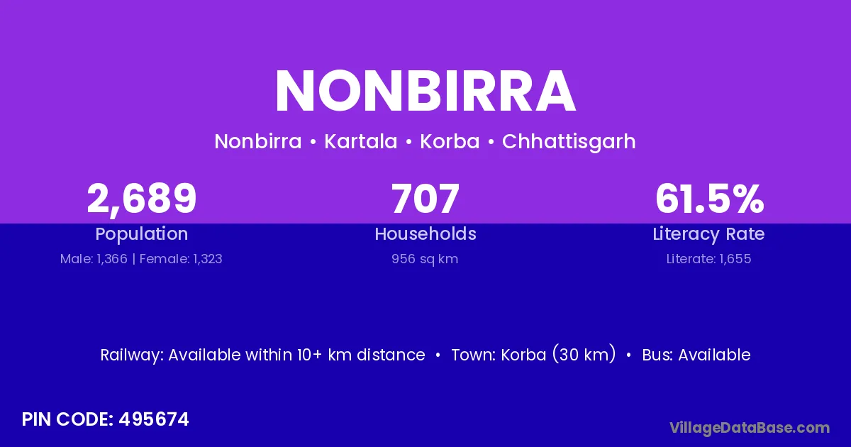 Korba (30 km) is the nearest town to Nonbirra village for major economic activities and is located approximately 30 km away.