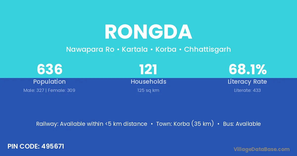 Korba (35 km) is the nearest town to Rongda village for major economic activities and is located approximately 35 km away.