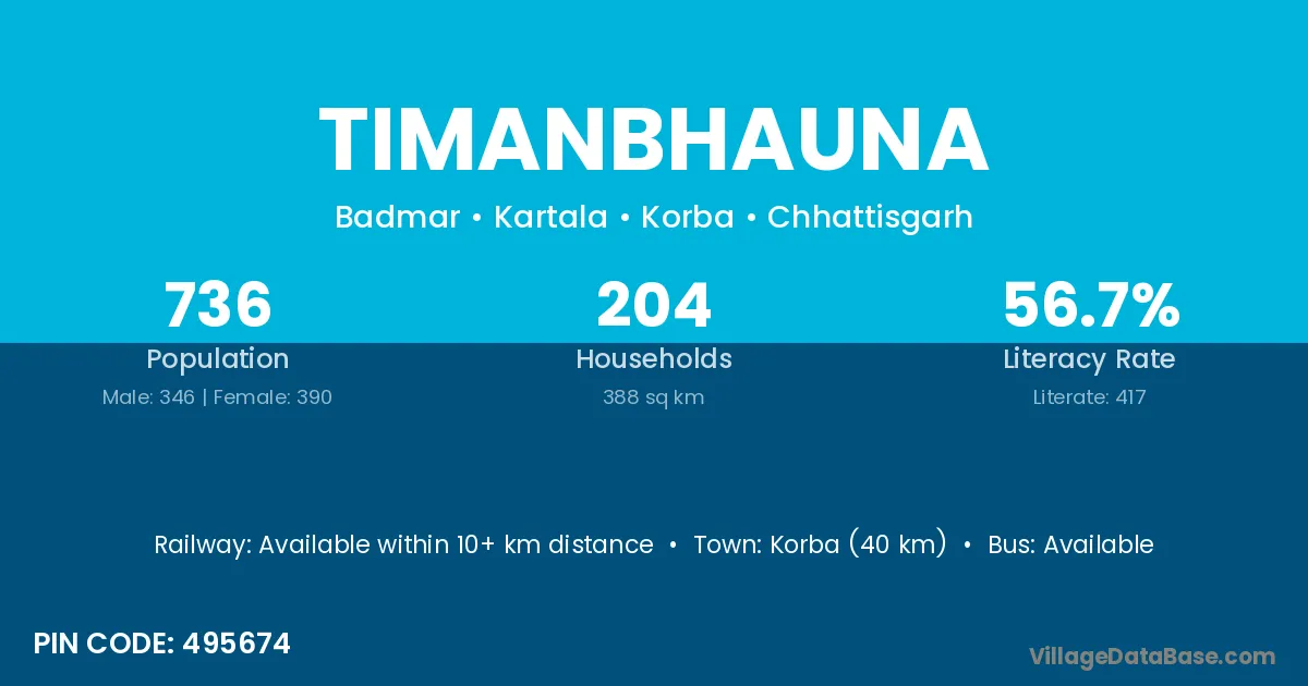 Korba (40 km) is the nearest town to Timanbhauna village for major economic activities and is located approximately 40 km away.