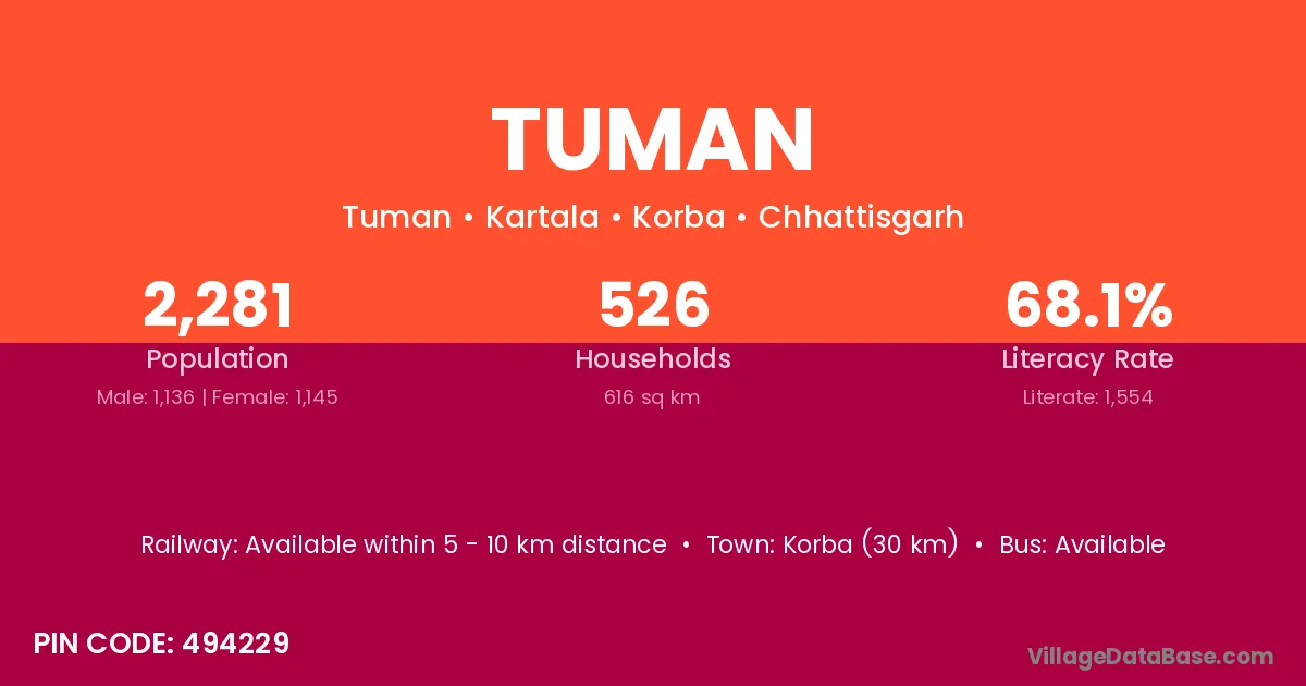 According to Census 2011 information, the village code of Tuman village is 494229.