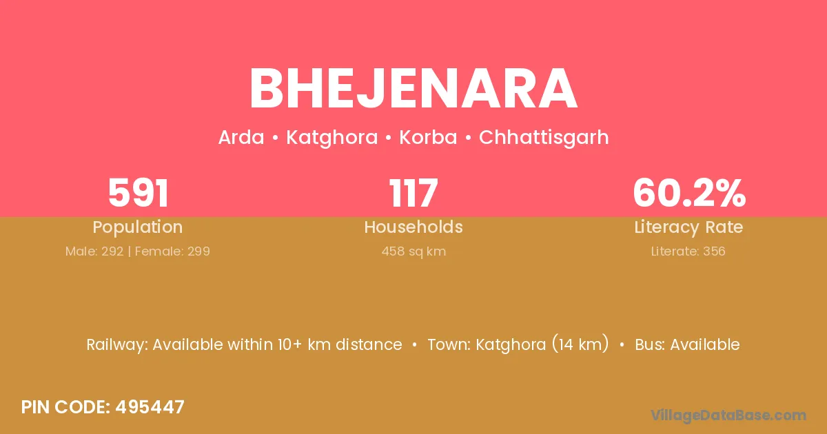 Katghora (14 km) is the nearest town to Bhejenara village for major economic activities and is located approximately 14 km away.