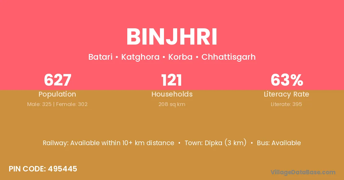 Binjhri village has a total population of 627 people, of which 325 are males and 302 are females.