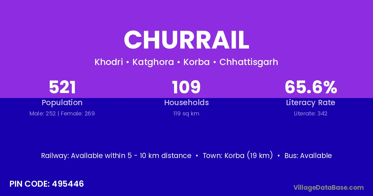 Korba (19 km) is the nearest town to Churrail village for major economic activities and is located approximately 19 km away.