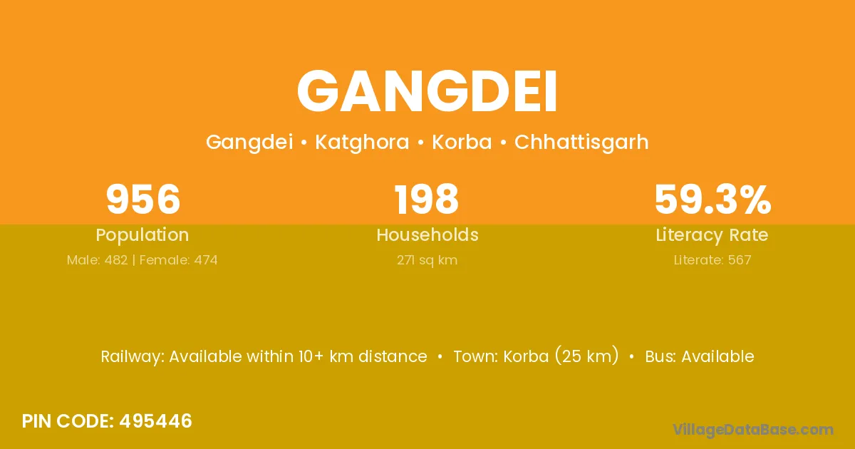 Korba (25 km) is the nearest town to Gangdei village for major economic activities and is located approximately 25 km away.