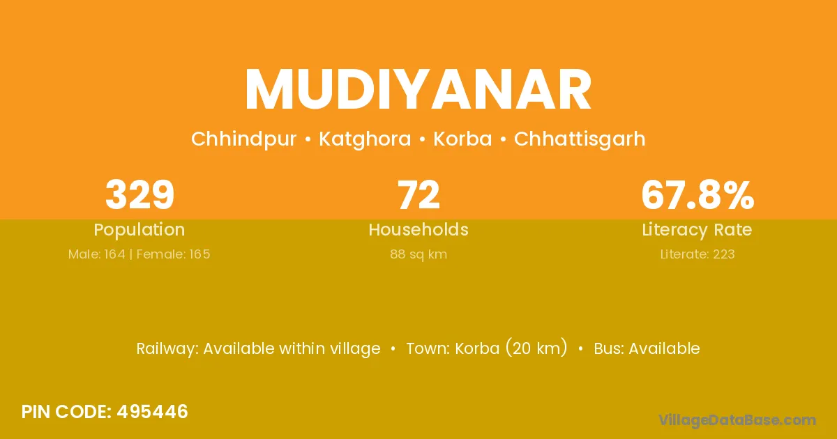 Korba (20 km) is the nearest town to Mudiyanar village for major economic activities and is located approximately 20 km away.