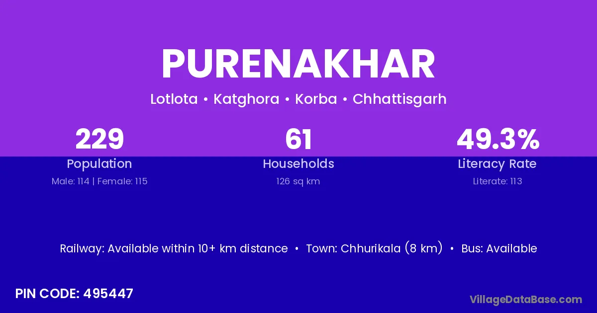 Purenakhar village has a total population of 229 people, of which 114 are males and 115 are females.