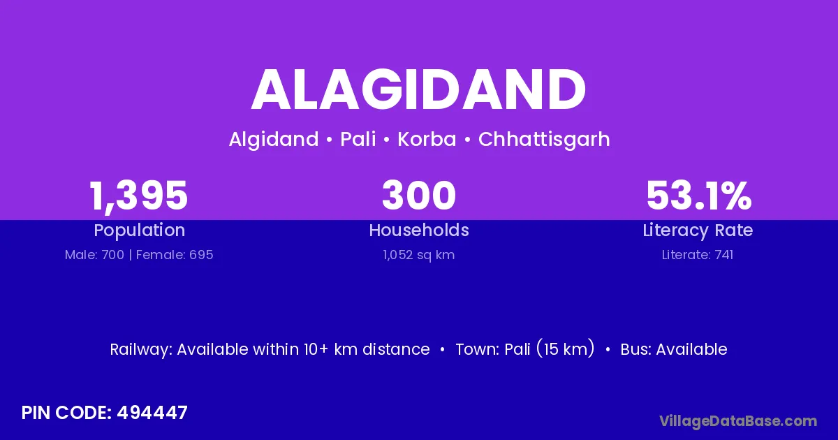 Alagidand village has a total population of 1,395 people, of which 700 are males and 695 are females.