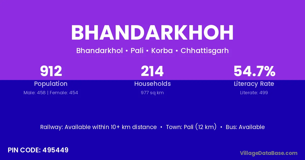 Bhandarkhoh village has a total population of 912 people, of which 458 are males and 454 are females.