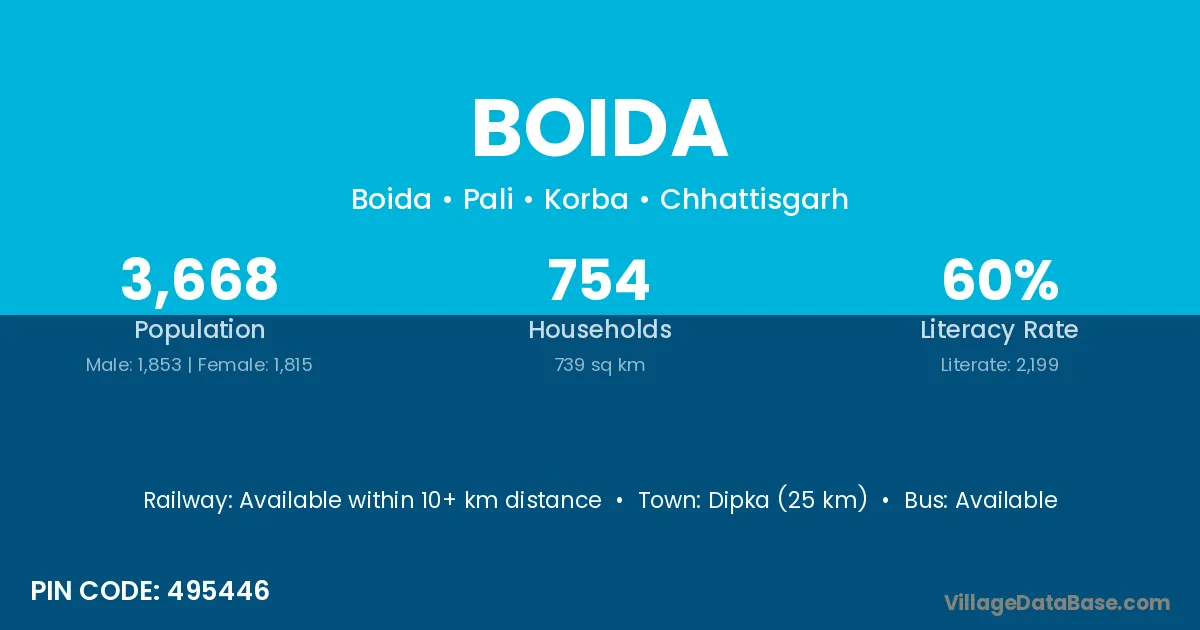 Dipka (25 km) is the nearest town to Boida village for major economic activities and is located approximately 25 km away.